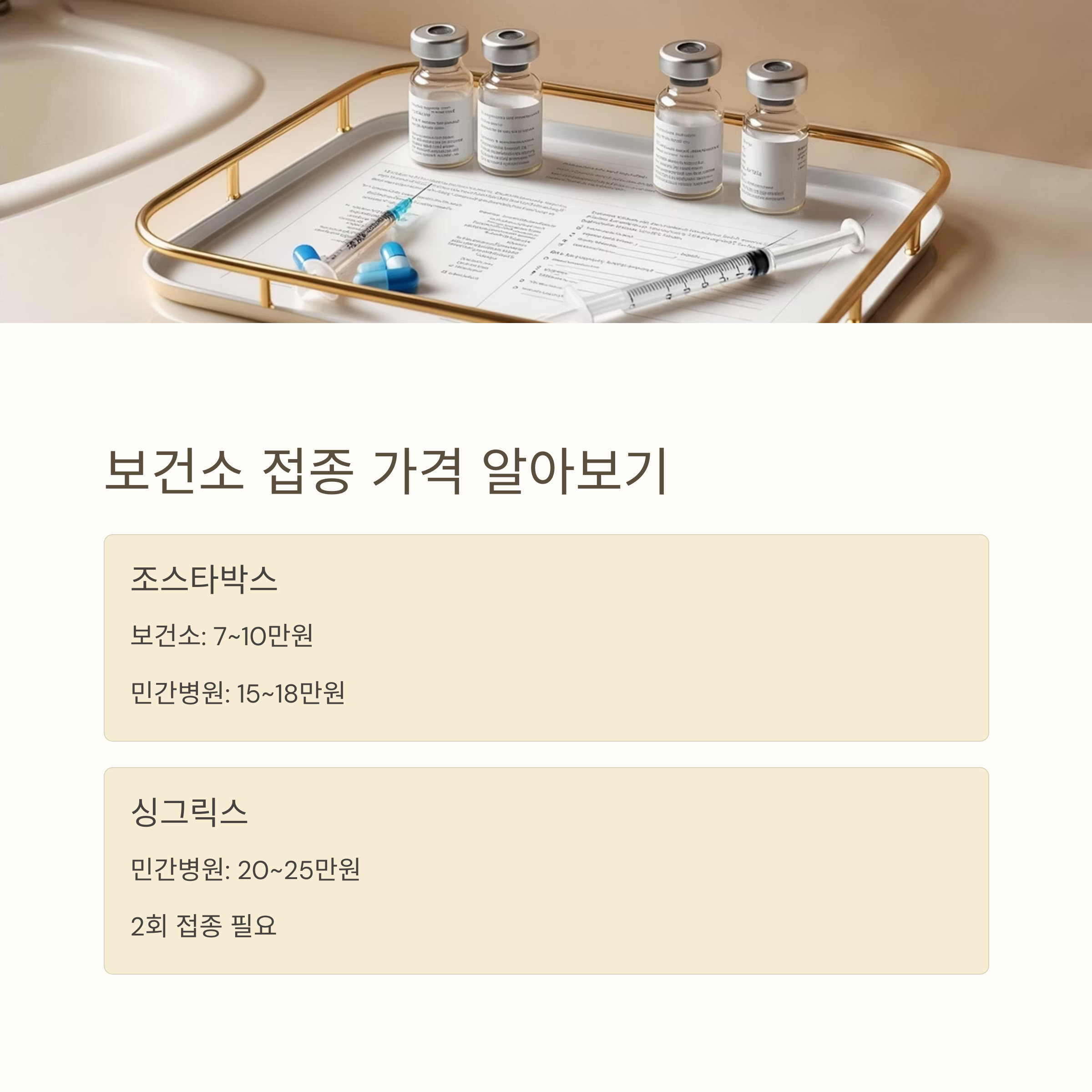 | 싱그릭스 | 민간 병원 | 1회당 약 20~25만 원 | 2회 접종 필요 |